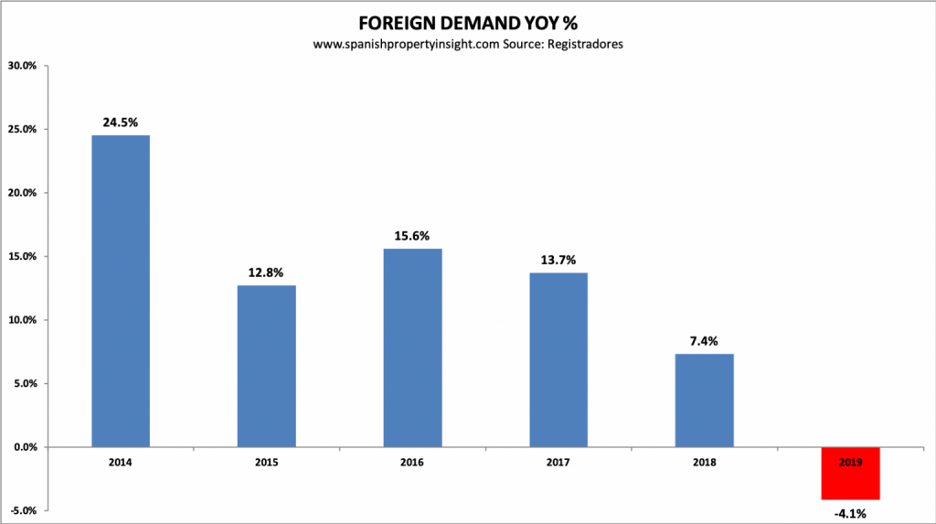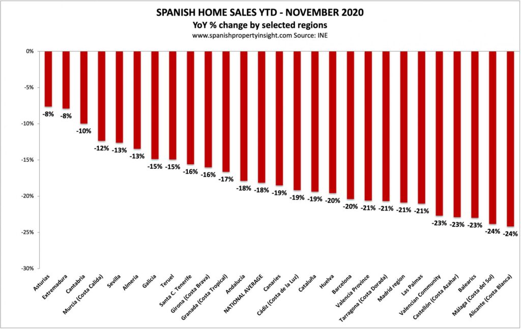 Kijken we naar de regio’s in Spanje dan zien we dat aan de populaire costa’s zoals de Costa Blanca minder huizen zijn verkocht.