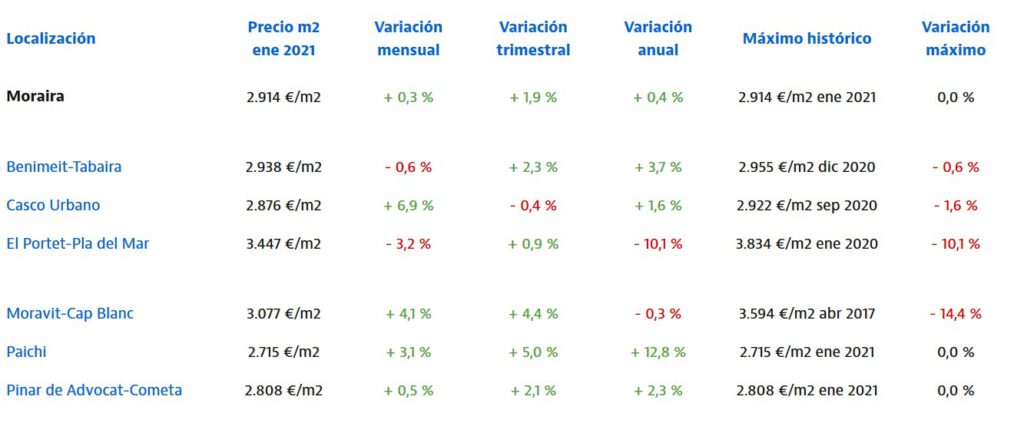 De historisch hoogste gemiddelde pijs per m2 werd bereikt in januar 2020 met een prijs van gemiddeld € 3.834 per m2 voor een villa in el Portet en Pla del Mar Moraira. Per december 2020 is de gemiddelde prijs € 3.561, een daling van circa 7.1%