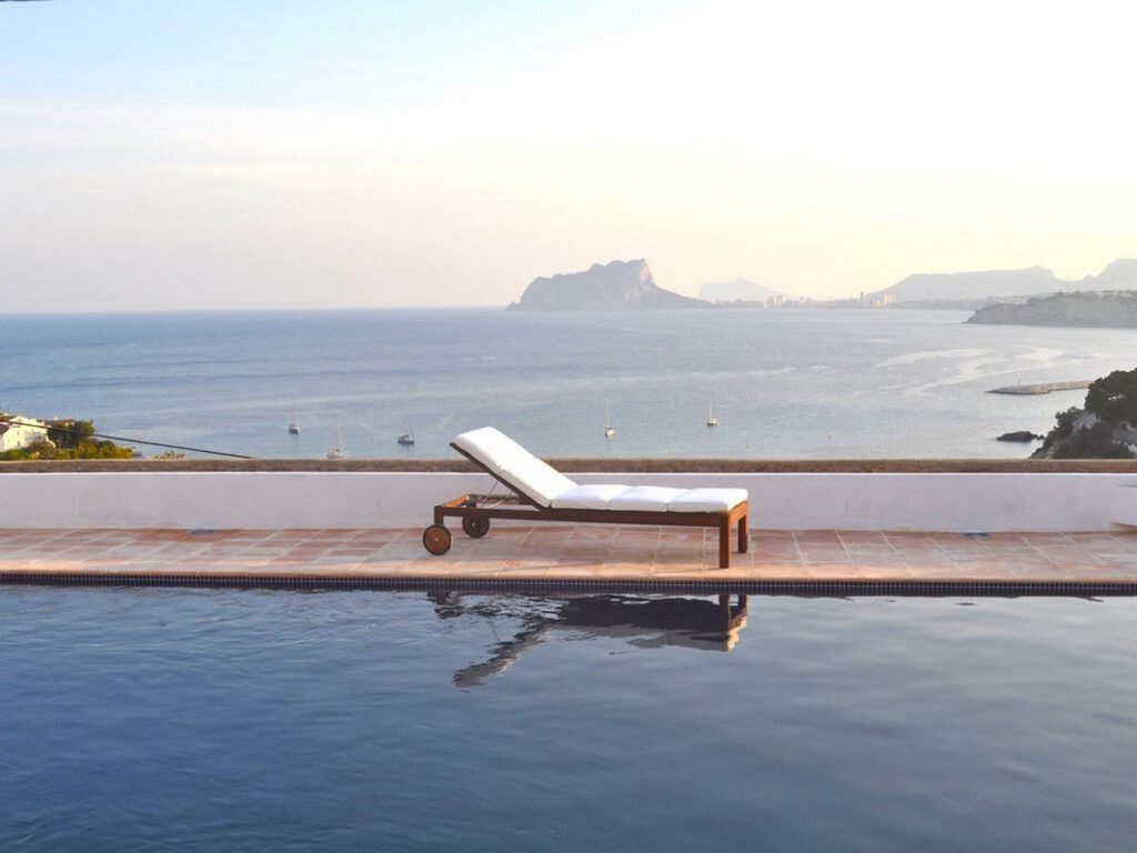 villa in el Portet Moraira met panoramisch zeezicht. ruime villa met 5 slaapkamers solide gebouwd in een traditionele Iberische stijl met volop hout, grote vloertegels en volop karakter. eyecatchers zijn de grote en zware houten deuren en draagbalken.