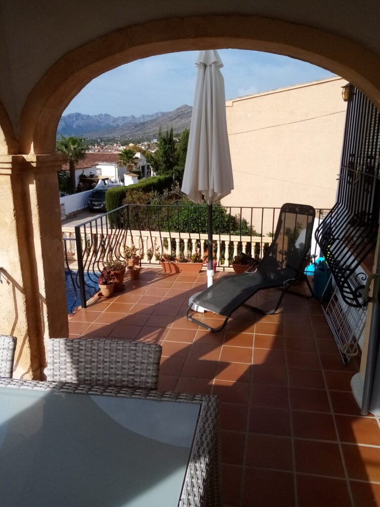 Vanuit het huis en terras zijn er mooie wijdse uitzichten naar naar de heuvel, platteland en het stadje Benissa